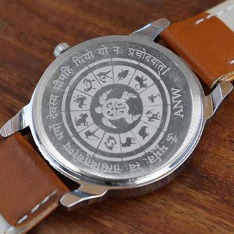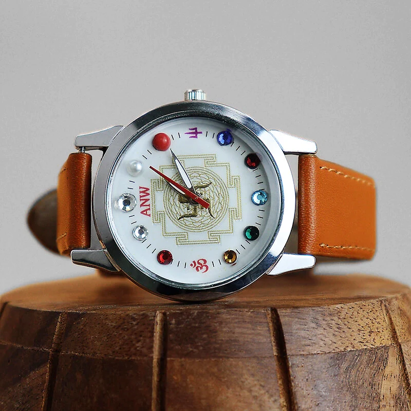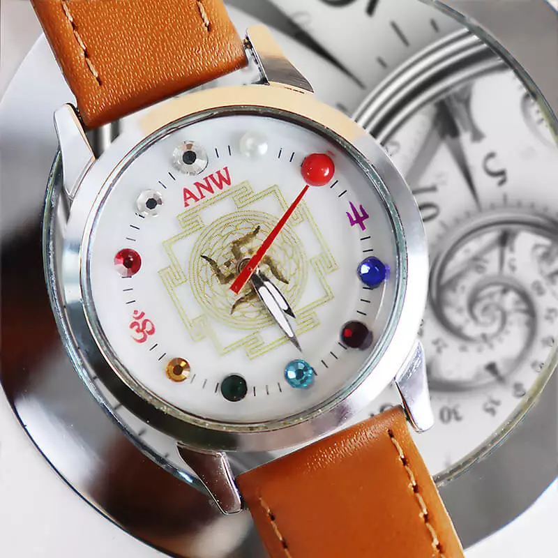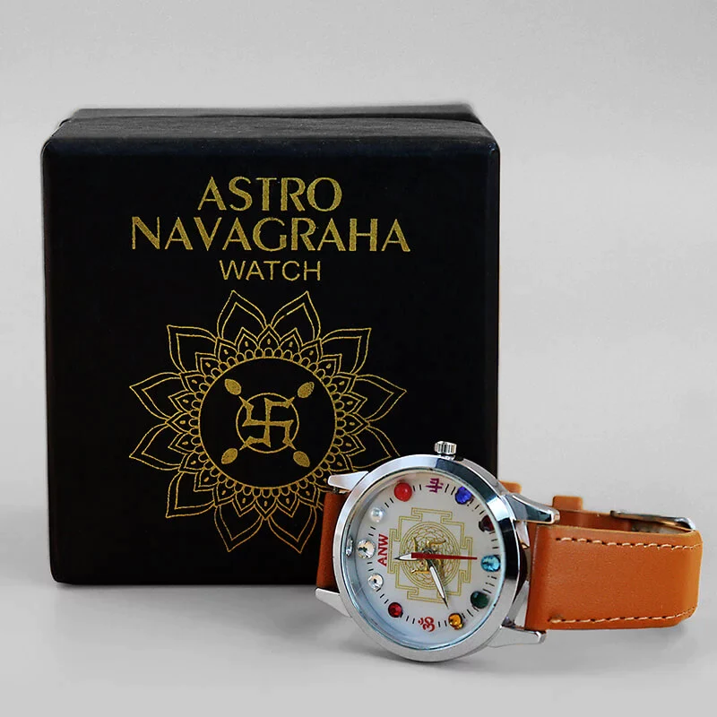 Empower Your time with this Astro Navgrah Watch which is a masterful fusion of style and cosmic precision. It has carefully crafted Shri Yantra at the center, with the signs of Satiya, AUM and trishul respectively. And tortoise and Navgrah signs at the back, with the royal brown shade band and silver dial. Astro Navgrah Watch brings you good luck and prosperity.